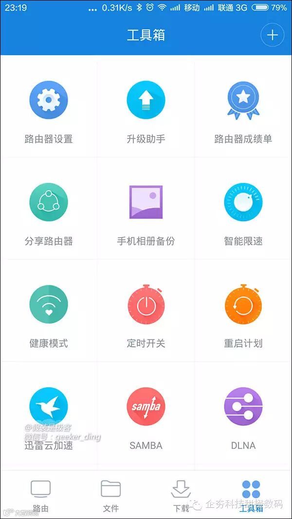小米路由APP提供了路由、文件、下载、工具箱四项功能。