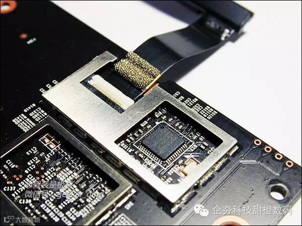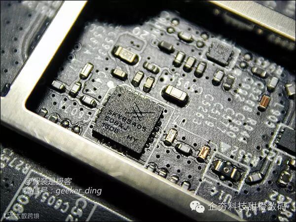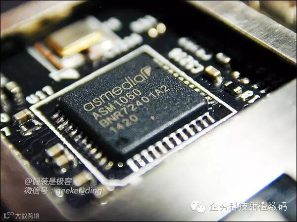 另一个屏蔽罩下面是华硕旗下祥硕科技的ASM1060芯片。这款芯片是PCIE X1转SATA控制器,支持速度最高6Gbps。同时,引出了SATA接口。通过PCIE接口扩展SATA后可以保证更高的数据传输速度,比通过USB接口效率更高、更稳定。