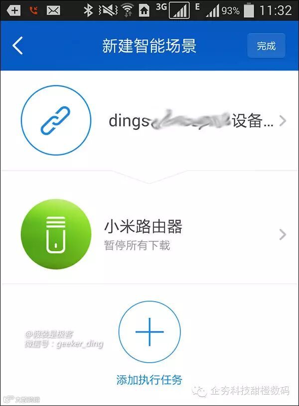 目前所谓的智能家居控制中心功能还比较简单,主要是可以直接管理智能硬件。通过选择相应的硬件,可以打开他们APP的应用。另外,也可以建立一些智能应用的场景,方便进行网络或其它管理。比如,我们可以设置当接入某个设备时,触发相应的功能。在上图中,《假装是极客》设备了当某台笔记本接入时,路由器暂停所有的下载。