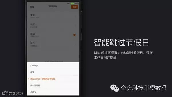 功能描述:MIUI闹钟可设置为自动跳过节假日,只在工作日闹钟提醒。
