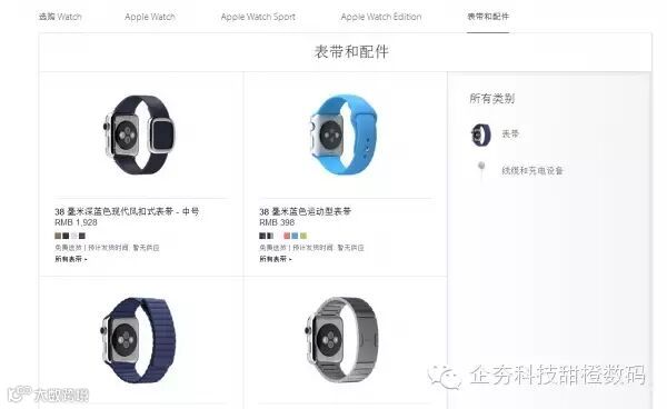 苹果官方也提供了8种额外的表带,除了金属表带外,都可以提供多种颜色选择,价格从398-3588元不等。而官方的磁力充电线价格则为238元(1米)和298元(2米)。