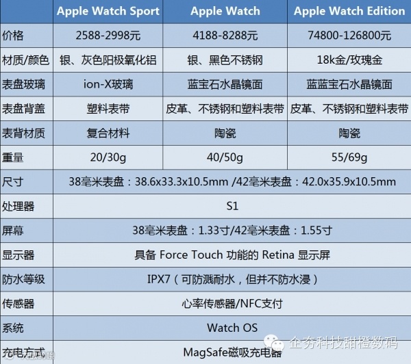 Apple Watch从有三个不同版本,运动版、基础版和高阶的定制版。所有版本都有38毫米和42毫米表盘的细分,分别对应男女款。
