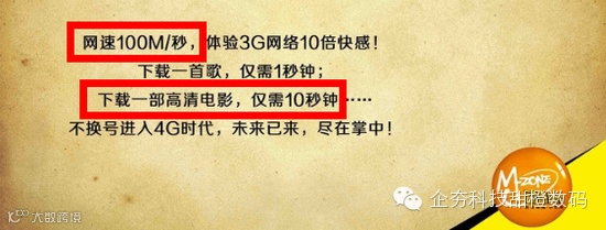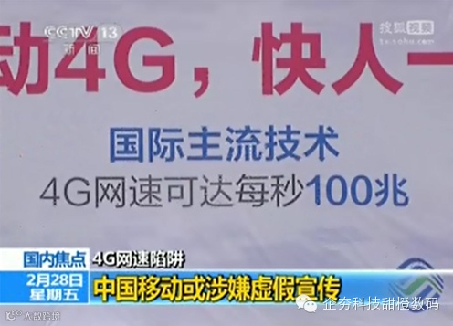 在4G牌照发放后,中国移动在国内各大媒体投放了自己的广告。各地的广告虽然种类繁多,但内容却是大同小异,一般是强调移动的4G网络下载速率可以达到100Mbps。通过移动4G下载高清电影,甚至只需要10秒钟。铺天盖地的广告过后,不少不明真相的媒体更是惊呼:有了4G以后就再也不需要有线宽带了!