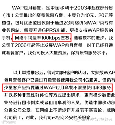 从用户当年的合约不难看出,当初签订的协议只是规定通过CMWAP节点上网可以享受不限流量,而不是所谓的“WAP套餐只能访问WAP网站”。换句话说,只要移动还保留着CMWAP上网方式,用户的诉求并没有不妥之处。实际上,用户投诉的焦点并不是无限制的使用4G网络,而是希望正常使用原来的套餐。因为少部分无限流量套餐用户对4G的无理需求,进而千方百计限制全体无限流量套餐用户的正常使用,这才是用户投诉的关键。当然,这也是移动避而不提的。不难看出,移动所说的“依法合规解决WAP包月套餐争议”本身就是一种彻彻底底的忽悠。