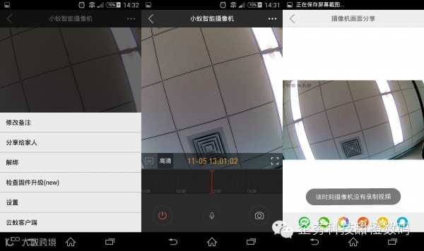 小蚁智能摄像机使用了F/2.0光圈,111°广角与4倍数码变焦支持,录制视频分辨率为1280*720。由于硬件上的原因,小蚁智能摄像机录制出来的视频较为鱼眼,畸变明显,但对于家庭使用来说,能看到更大的空间范围才是重要的呢。并且小蚁智能摄像机还支持双向通话功能,只需要在界面中按住通话键即可实现通话,实际测试通话效果足够清晰与洪亮。而最为关键的实时视频查看,其提供了两种清晰度,在较低的宽带速度中也能保持足够的流畅性。