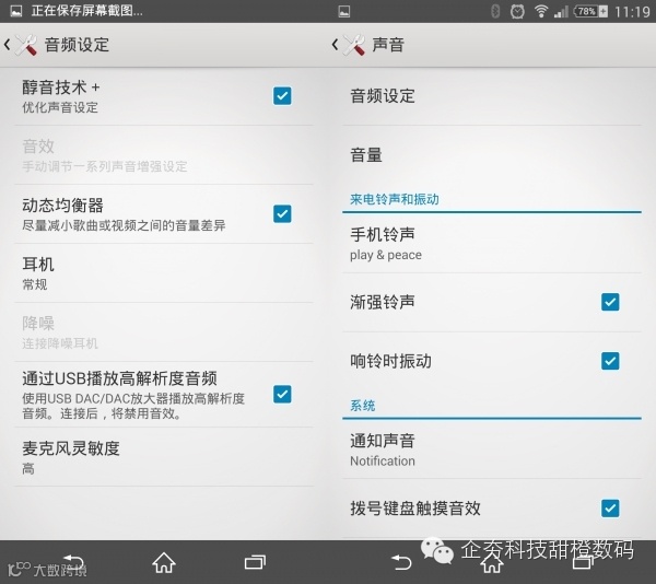 Xperia Z3在音频功能上并没有新增多少功能,但在界面细节上优化简便了不少。其中Xperia Z3针对索尼移动目前在售耳机还有相应的特别调音,可以直接选择。此外让人吐槽的是,Xperia Z3新增的DSEE HX功能并不能在系统音频界面中选择,而必须要在Walkman音乐播放中才会出现。此外,在Xperia Z3上依然默认支持NDR-NC31E降噪耳机与STM10高清麦克风,但细节设置则分别在调音与麦克风灵敏度上进行设置。