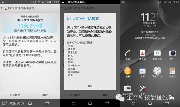 Ultra STAMINI模式其实就是STAMINI模式极致版,在提供一定功能的情况下,能显著提升使用时间,并且在说明中也表示了该模式用于长时间无法充电的情况下使用。在Ultra STAMINI模式下,Xperia Z3仅仅提供基本功能,娱乐方面仅剩下相机、相册了。此外,在Ultra STAMINI模式下,Xperia Z3最长可待机30天,使用时间也达到了10天。(一秒变功能机)