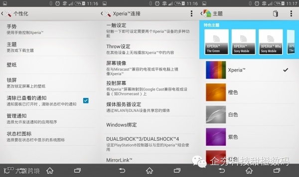 个性化与Xperia连接功能基本没有改变,新增了一个与Google Cast连接功能,但基本没啥用处。主题方面,Xperia Z3新增了一个Xperia主题,也就是多种颜色过渡变化。