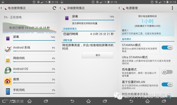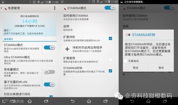 此外,在Xperia Z3上继续增强相关的电源管理。如STAMINI模式更为细致的处理与管理,也是Xperia Z3宣称提供两天正常使用电量的原因。而全新加入的Ultra STAMINA模式,也使得待机使用可达到一个月。