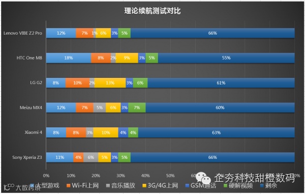 在理论续航测试中,电池容量为3100mAh的Xperia Z3表现出色,与4000mAh的联想VIBE Z2 Pro的成绩平分秋色,这样的成绩可谓相当优秀。