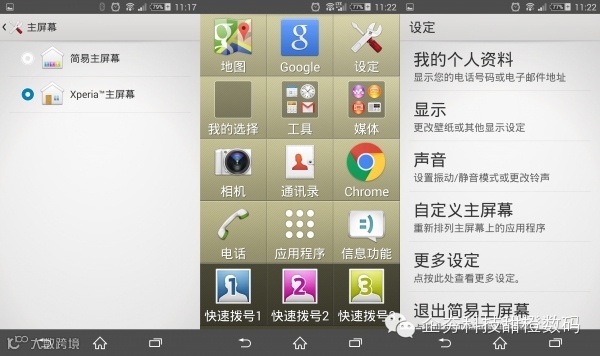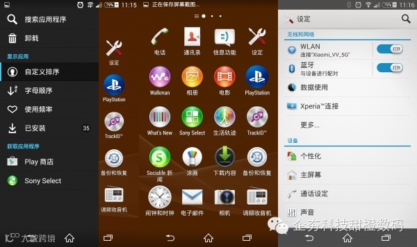 主界面依然有多桌面与小部件、主题、壁纸等切换。唯一比较直观的改变就是桌面图标变大了不少。进入到程序界面中,也能布局设计基本不变,但图标大了不少。Xperia Z3系统UI上的最大改变,相比就是图标变大,如同原生Android桌面一样,这也可能让不少人纠结。进入设置界面,依然是没有大改变,但能够直接看到Wi-Fi连接的网络名。