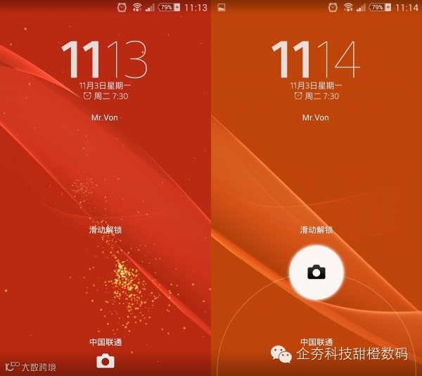 在锁屏界面并没有明显改变,依然是星点的动态效果,也就是Xperia Z2的要更为明显绚丽些。在锁屏界面可以快速的开启拍摄界面,但在实体快门键面前,这个功能略显无趣。