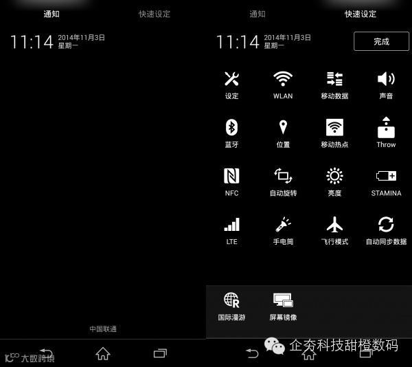 下拉栏依然分为分为通知与快速设定,其中快速设定可以直接在通过编辑来调整数量与顺序,比Xperia Z2要简便些,但依然不能通过直接长按跳入相关设置页面。
