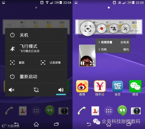 长按电源键菜单中,终于出现了重新启动的选项,此外还新增了一个记录屏幕的功能。这个记录屏幕可以实现录制屏幕以及记录前置摄像头两个影像,视频质量最高为1080P,这个功能可以作为应用演示等各种用法。