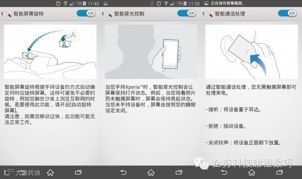 在体感功能上,索尼一直很克制,到Xperia Z3上也只有三个类似的细节功能,并且还分散在不同的设置选项中,略显纷乱。这三个功能分别是“智能屏幕旋转”、“智能背光控制”与“智能通话处理”,后两者很好理解,而前者其实就是可以实现躺下也不怕屏幕判定为横向。