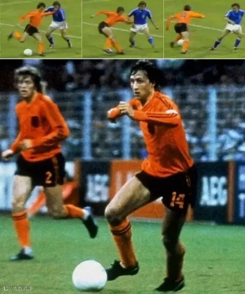 5.克鲁伊夫转身:荷兰-瑞典(1974),克鲁伊夫假装射门,右腿摆动的很夸张有力,却没有碰到球,而是快速的划过足球,再迅速地收回来,然后把足球从自己身后磕到了左侧–也就是重心倒向的那个方向,接着身体迅速转身,在转过去的同时又用右脚把足球向外拨动了一点,紧接着抡左脚射门!足球应声入网。这是球迷们首次看到这样的动作。