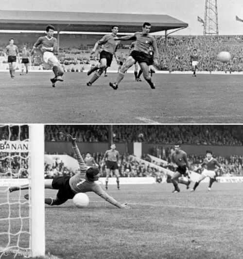 3.贝利射门,班克斯扑救:英格兰-巴西(1970),球王贝利大力射门,被英格兰守门员戈登·班克斯奋力扑出。这被认为是足球史上最伟大的扑救。
