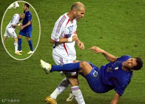 4.齐达内头撞马特拉齐:法国-意大利(2006决赛),马特拉齐用粗话污辱齐达内的爱妻,齐达内一气之下用脑袋撞向马特拉齐,他也因此被红牌罚下。