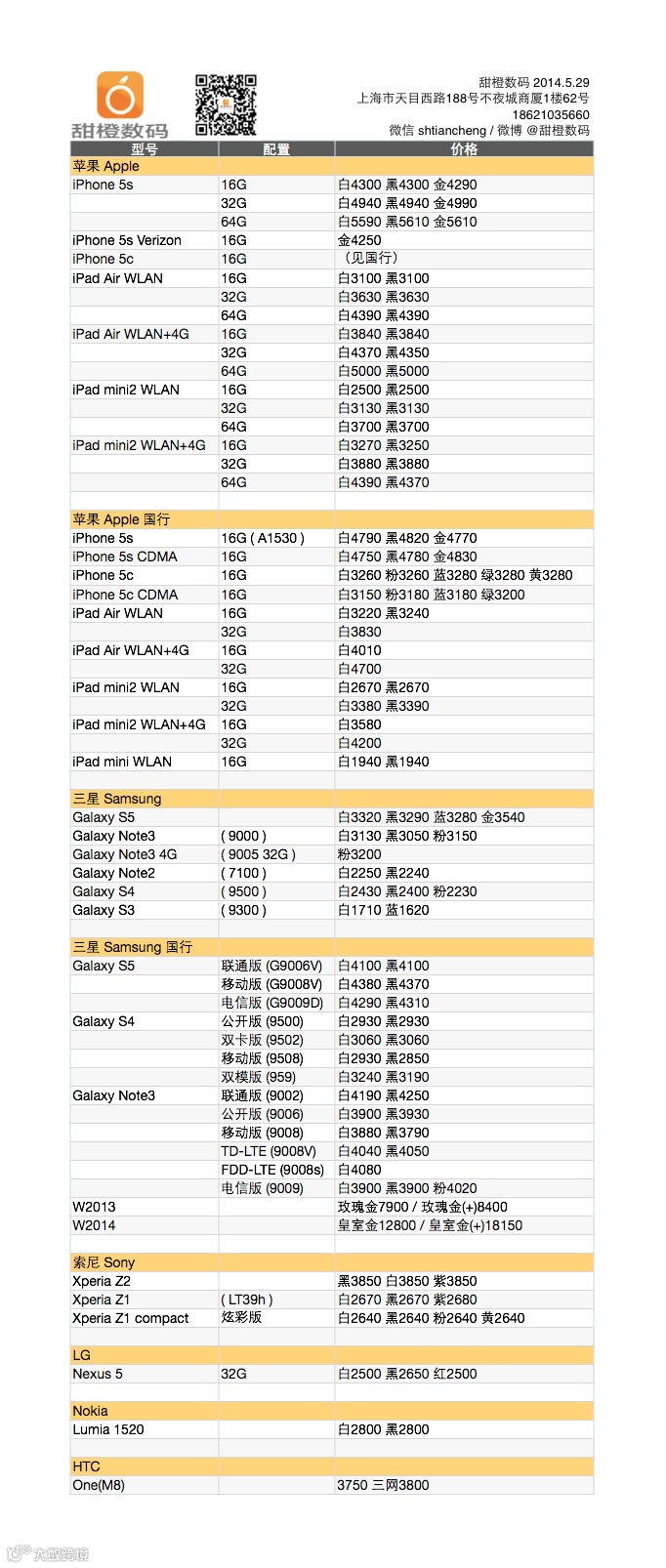 企夯科技甜橙数码Galaxy S5 国行各版持续走低;为迎战,Sony 新旗舰 Xperia Z2 大跌,Z1 及 Z1 炫彩版也有不小降幅;iPhone 5s 小涨 10 元,目前只有土豪金仍守住 4300 以下关口;iPad mini2/Air wifi 版大都小涨 10 元;Galaxy Note3 水货小涨。