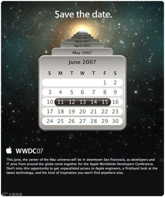 2007年6月,苹果WWDC大会,苹果发布了Mac OS。乔布斯向大家介绍了iPhone ,这也是iPhone问世的第一个发布会。