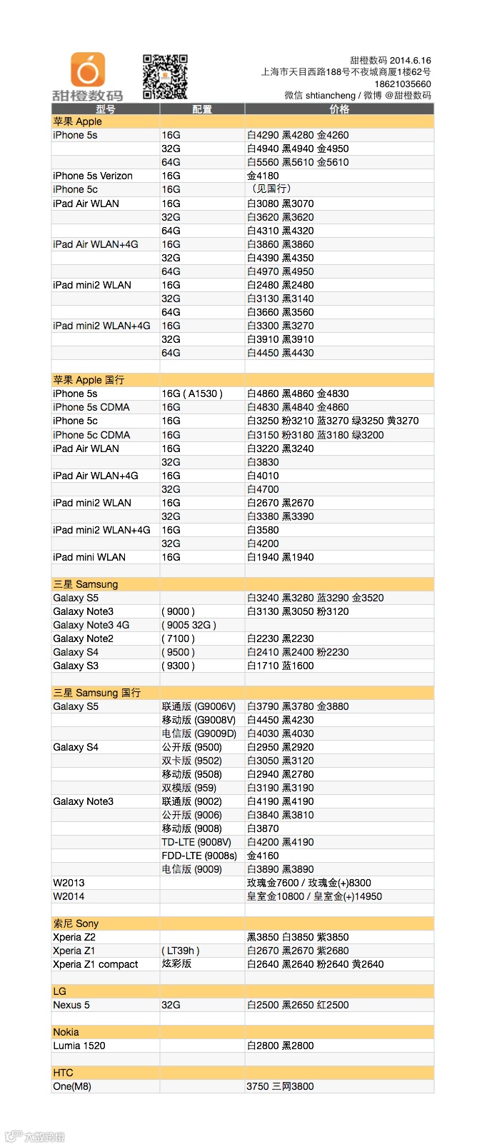 企夯科技甜橙数码iPhone 及 iPad 各型号今天均稳定;三星 Galaxy S5 小跌,Galaxy S4 稳定,而 S3 略有小涨;Galaxy Note3 有小幅震荡,但涨跌均不超过 10 块。