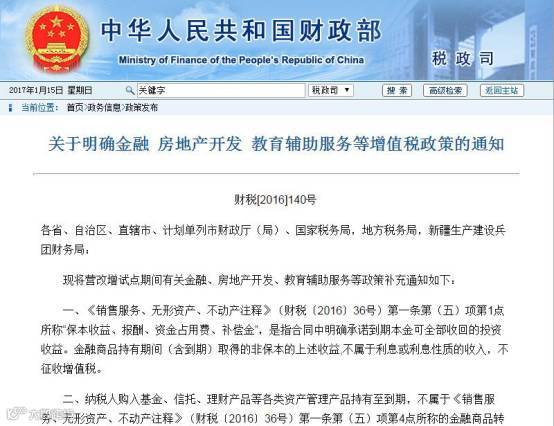 对于1月11日下发的140号文补充意见,这份通知表示,资管产品运行过程中要交的增值税本来是要追溯至2016年5月1日的,现在不仅不追溯了,还延缓至2017年7月1日,业内人士称,这不仅解决了已经到期结束或者合同已经签署产品可能发生的纠纷问题,还给了资管公司缓冲的时间,下一步如何和客户沟通“预期收益”的问题!同时,更重要的是,资管公司还期待,140文的配套细则能够进一步明确,包括可能涉及的金融产品嵌套如何纳税、资管公司估值方法是否需要改善等等。