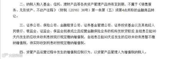 “2、纳税人购入基金、信托、理财产品等各类资产管理产品持有至到期,不属于《销售服务、无形资产、不动产注释》(财税〔2016〕36号)第一条第(五)项第4点所称的金融商品转让。”