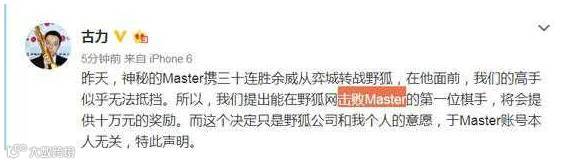 围棋大神古力在微博上率先发出“悬赏令”,谁能击败Master就给谁10万元奖励。(10万元!小编得码多少字,让我来……)