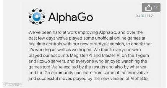 不过连胜纪录仍在继续,收官之战,Master对战古力,拿下第60胜,1月4日晚上Master宣布“结束挑战”。当日Master的身份也正式公布,没错,就是那个曾经和李世石人机大战的Alpha Go,人们把它称为“阿尔法狗”。