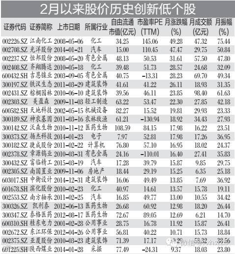 这些新低个股中有39只个股在2月累计下跌,其中跌幅最大的是美邦服饰,2月跌幅达到了28.17%,省广股份、神州泰岳和环旭电子的跌幅位居第二至第四名,分别下跌8.5;7%、5.18%和4.77%。不过还有一部分个股是在月初承接1月跌势创出新低,而后触底又逐步震荡上扬的,这些个股共有85只,在2月普遍出现不同程度的上涨。其中,江南化工、光洋股份和恒邦股份的涨幅位居前三位,分别在2月累计涨幅达到了49.28%、47.47%和31.61%。