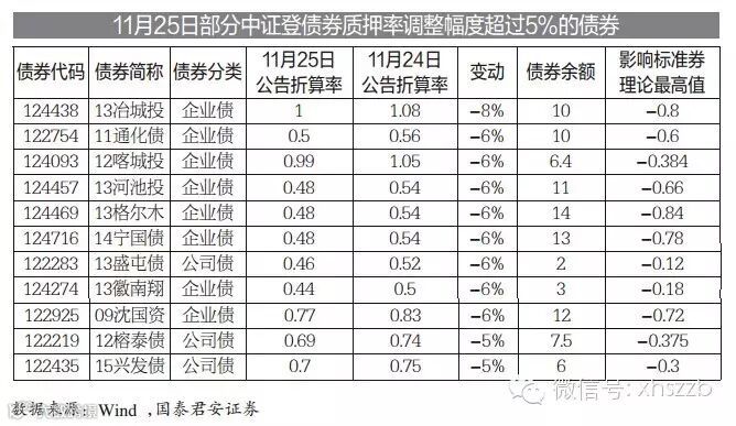 11月25日晚,中证登发布《中国结算进一步完善债券质押回购精细化动态调整风险管理机制》的通知称,本周始,将依据现有规则综合考虑回购债券的集中度、流动性和信用情况等相关因素,对部分回购质押债券标准券折算率予以动态调整,并逐步完善质押券差别化动态管理机制。