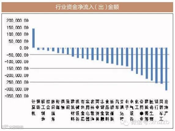 行业方面,28个申万一级行业中,昨日仅计算机板块逆势获得资金净流入,净流入金额为13.90亿元;其余27个行业板块悉数呈现净流出窘境,其中房地产、国防军工、银行板块净流出金额居前,分别为31.07亿元、26.42亿元和25.99亿元,钢铁、轻工制造板块净流出金额较小,分别为1.54亿元和1.64亿元。