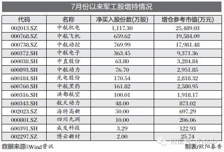 Wind数据统计,7月份以来,32家国防军工公司共有14家被重要股东净增持,增仓参考市值总计8.79亿元。