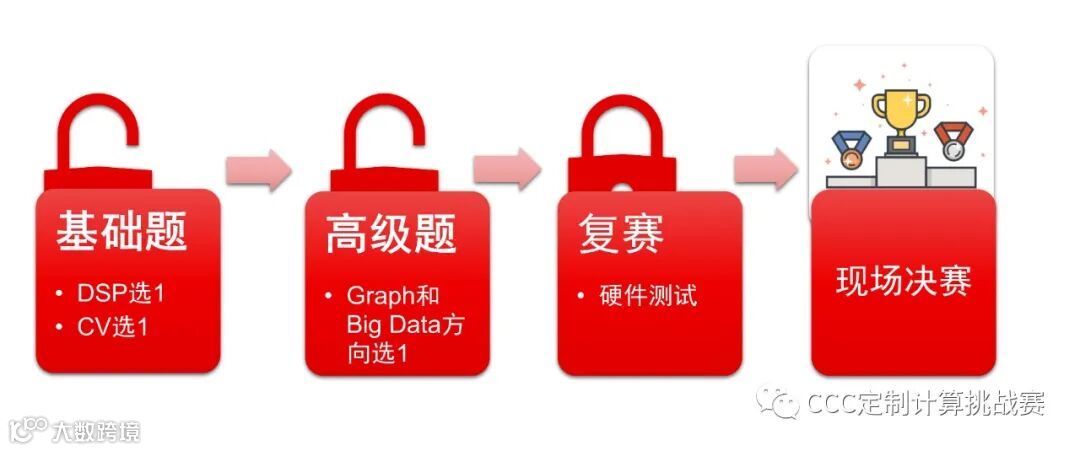 CCC2022赛制基本不变,比赛以团队进行,每队最多2人,可跨单位组队。队伍需至少完成基础2题和高级1题,每题根据性能指标排名获得积分,最终选出积分排名前10%的队伍进入复赛,复赛需完成硬件实际性能的评测。
