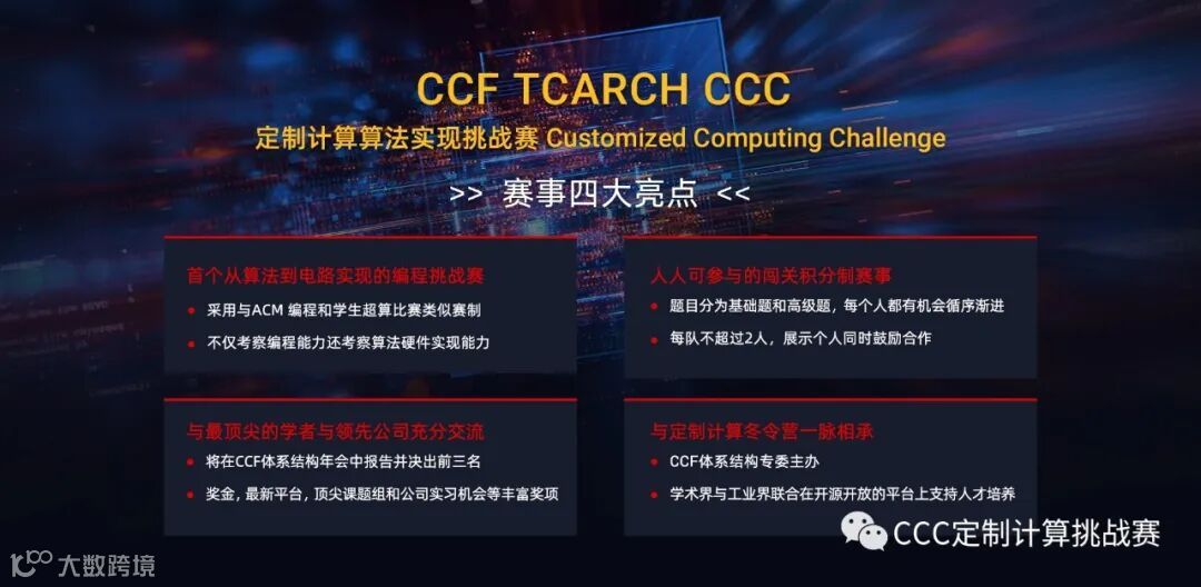 CCC简称定制计算挑战赛,是首个从算法到电路实现编程挑战赛,不仅考察编程能力还考察算法硬件实现能力。赛事以培养学生从算法到硬件加速的能力为主,除了万元奖励外,参赛同学将获得与学术界、产业界广泛交流的机会。顺利完赛的同学还有机会获得北大CECA,信息技术高等研究院,AMD-Xilinx等多个课题组以及公司的实习机会,是一次不容错过的科研前训练,技术交流的平台。