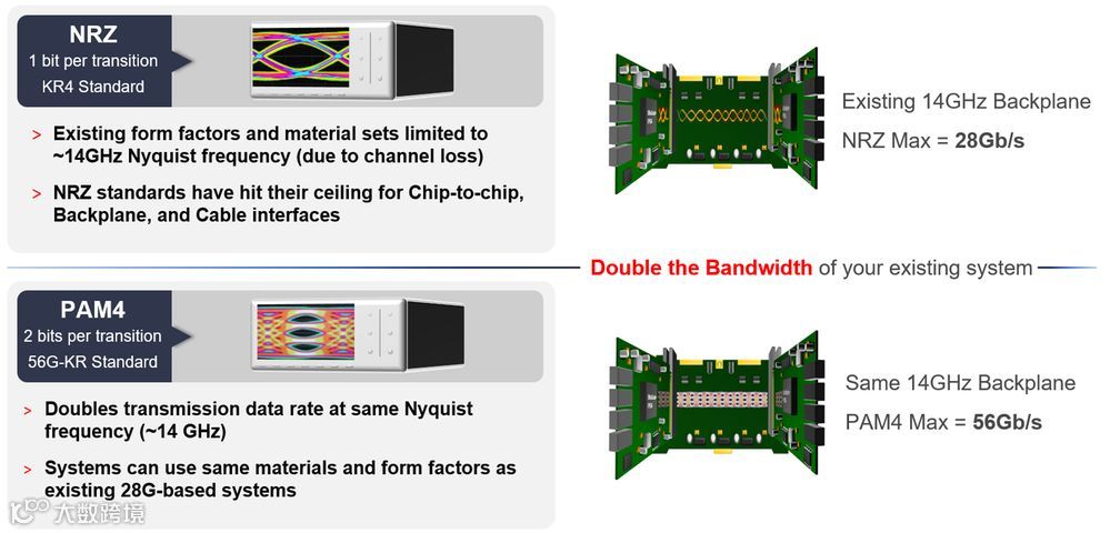 NRZ(non-return-to-zero,不归零码)是25Gb/s的标准编码方案,然而对于不断增长的容量、远程应用程序和数据传输速率的需求仍在增加,传统的NRZ信号高速互联的数据速率已经达到25Gb/s的上限,PAM4(4级脉冲调制)目前被广泛认为是25Gb/s以上数据传输速率下最健壮、最灵活的信令标准。
