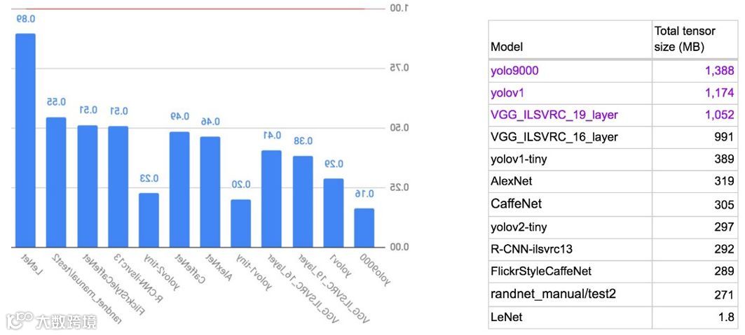 如果我们想要将模型部署到嵌入式平台,那么内存占用是一个生死攸关的因素。一个流行的平台Raspberry Pi 3具有1GB RAM; BeagleBoneBlack甚至更小的512MB RAM。但是,如果没有适当的内存分配,完全不可能在它们上部署yolo9000(总张量大小为1.4GB)。