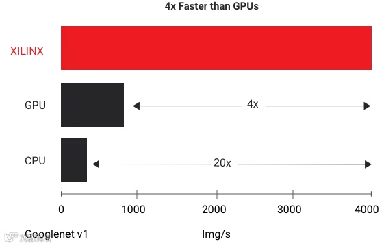 在数据中心 AI 平台上,对于低时延 AI 推断,赛灵思能以最低时延的条件下提供最高吞吐量,在 GoogleNet V1 上进行的标准基准测试当中,赛灵思 Alveo U250 可为实时推断提供比现有最快的 GPU 多出 4 倍的吞吐量。
