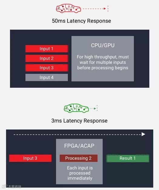 如下图所示,传统 CPU/GPU 只能在“高吞吐量”和“低时延”两者选择其一,如需低时延则无法满足大批量规模的吞吐量;而一旦需要使用大批量规模实现吞吐量,在处理之前,器件必须等待所有输入就绪之后再处理,从而导致高时延。而使用 FPGA,则可以采用小批量规模实现吞吐量,并在每个输入就绪之时开始处理,从而降低时延。