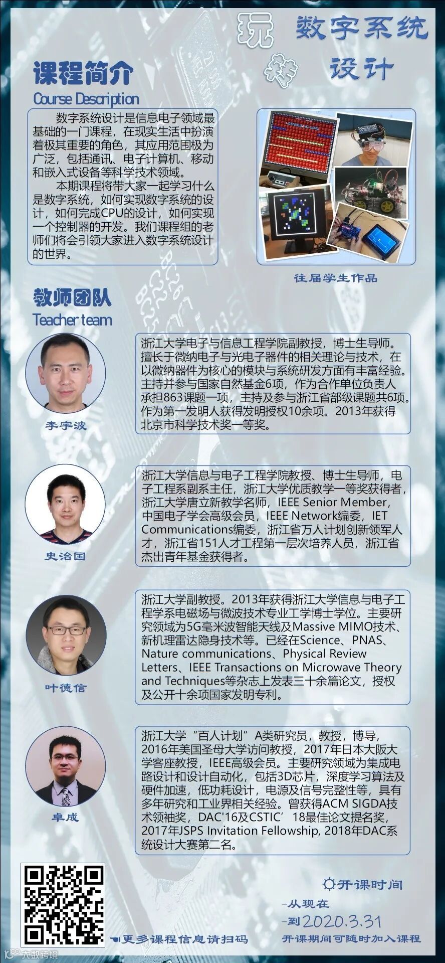 本课程,我们将会带领大家从零开始,了解数字电路和数字系统的基本概念。从数字逻辑基础出发,学习组合逻辑电路和时序逻辑电路,再到有限状态机的分析和综合,并在这些基础上,实现专用和通用微处理器的设计,最后培养大家能够具有数字系统设计的思维方式和对于中小型数字系统开发的能力。本课程团队阵容强大,由浙江大学信电学院的四位具有数字系统资深经验的老师为大家讲授,他们将会引领大家进入数字系统设计的世界。