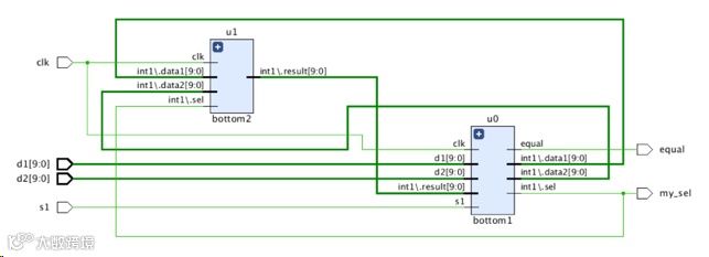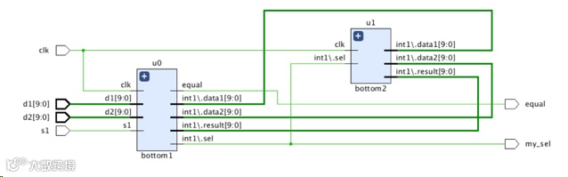 上面的 RTL 会对“bottom2”模块进行实例化,给它指定一个实例名称“u1”。 在“bottom2”模块中声明的接口“int1”现在与已在上一层声明的接口“int3”相关联。 进行这些更改后,设计的原理图如下所示: