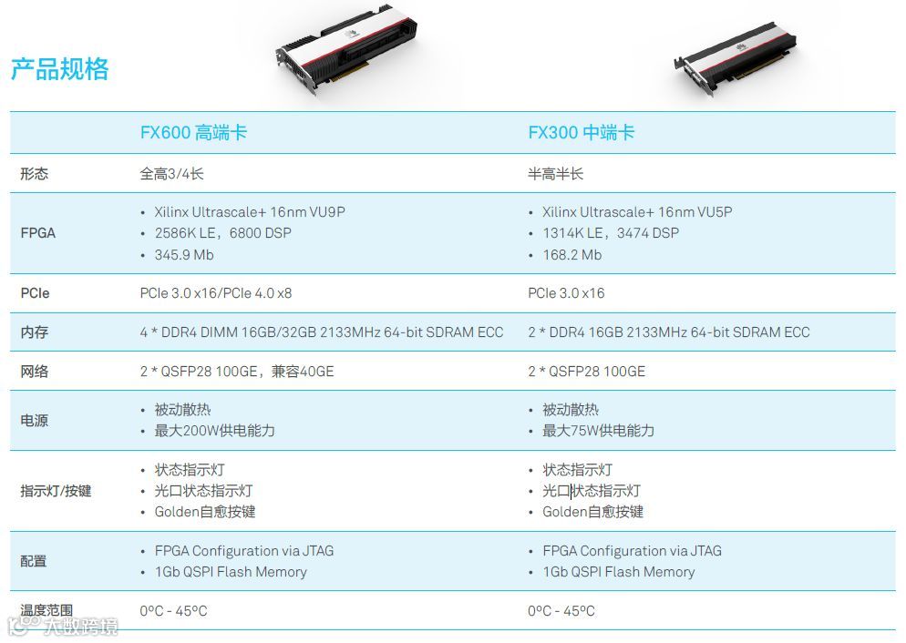 FX系列FPGA加速卡面向高性能场景,其基于Ultrascale+ 16nm VU9P/VU5P芯片的FX600/FX300加速卡,支持PCIe 3.0 x16互连通道,2*100GE网络通道,最大外挂128GB内存,整卡最大功耗支持200W。