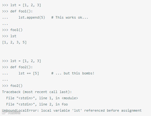 答案与前面那个例子是一样的,但又有一些微妙之处。foo1没有赋值给lst,而foo2赋值了。lst += [5]实际上就是lst = lst + [5],试图给lst赋值(因此,假设Python是在局部作用域里)。然而,我们正在寻找指定给lst的值是基于lst本身,其实尚未确定。