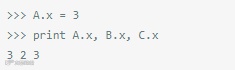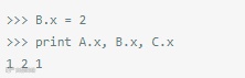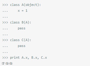 在Python中,类变量都是作为字典进行内部处理的,并且遵循方法解析顺序(MRO)。在上面这段代码中,因为属性x没有在类C中发现,它会查找它的基类(在上面例子中只有A,尽管Python支持多继承)。换句话说,就是C自己没有x属性,独立于A,因此,引用 C.x其实就是引用A.x。