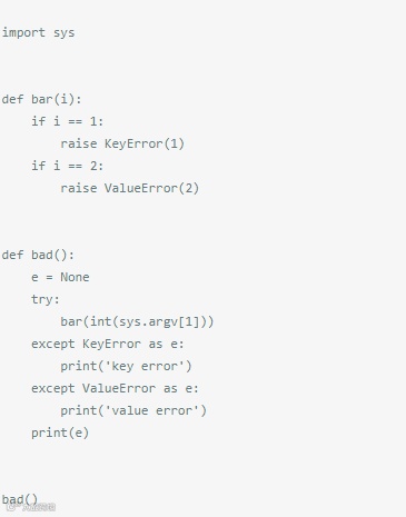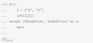 问题在这里,except语句并不需要这种方式来指定异常列表。然而,在Python 2.x中,except Exception,e通常是用来绑定异常里的 第二参数,好让其进行更进一步的检查。因此,在上面这段代码里,IndexError异常并没有被except语句捕获,异常最后被绑定 到了一个名叫IndexError的参数上。