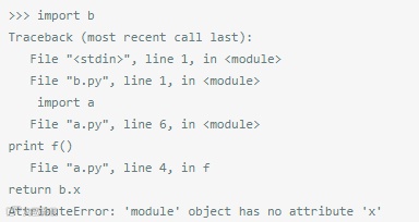 出错了,这里的问题是,在导入b.py的过程中还要试图导入a.py,这样就要调用f(),并且试图访问b.x。但是b.x并未被定义。