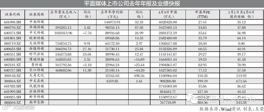 2014年,出版行业整体经营形势不佳,但业内多数上市公司业绩仍然平稳增长。Wind统计显示,12家平面媒体上市公司发布了2014年年报或者业绩快报,有9家公司业绩出现增长,尤其是天舟文化,通过对“神奇时代”的收购,新增移动网游戏业务,净利润同比增长了498.56%。