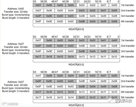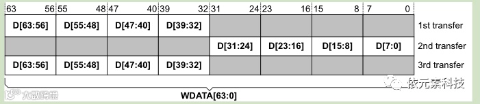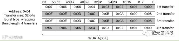 下图给出3次突发,起始地址为4,每次传输32bit,数据总线为64bit。