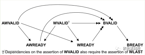 为防止死锁,通道握手信号需要遵循一定的依耐关系。①VALID信号不能依耐READY信号。②AXI接口可以等到检测到VALID才断言对应的READY,也可以检测到VALID之前就断言READY。下面有几个图表明依耐关系,单箭头指向的信号能在箭头起点信号之前或之后断言;双箭头指向的信号必须在箭头起点信号断言之后断言。