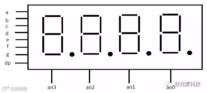 如下图所示,要数码管显示数字“3”,只需要电路数码管a、b、c、d、g段即可,对应的数码管二进制信号为“00001101”,4个公共端输出信号为“1110”。这种采用分时复用的模式轮流点亮数码管,同一时间只会点亮一个数码管。如果数码管扫描的速度足够快,人眼就分辨不出数码管是逐个点亮,认为4个数码管是同时亮的。